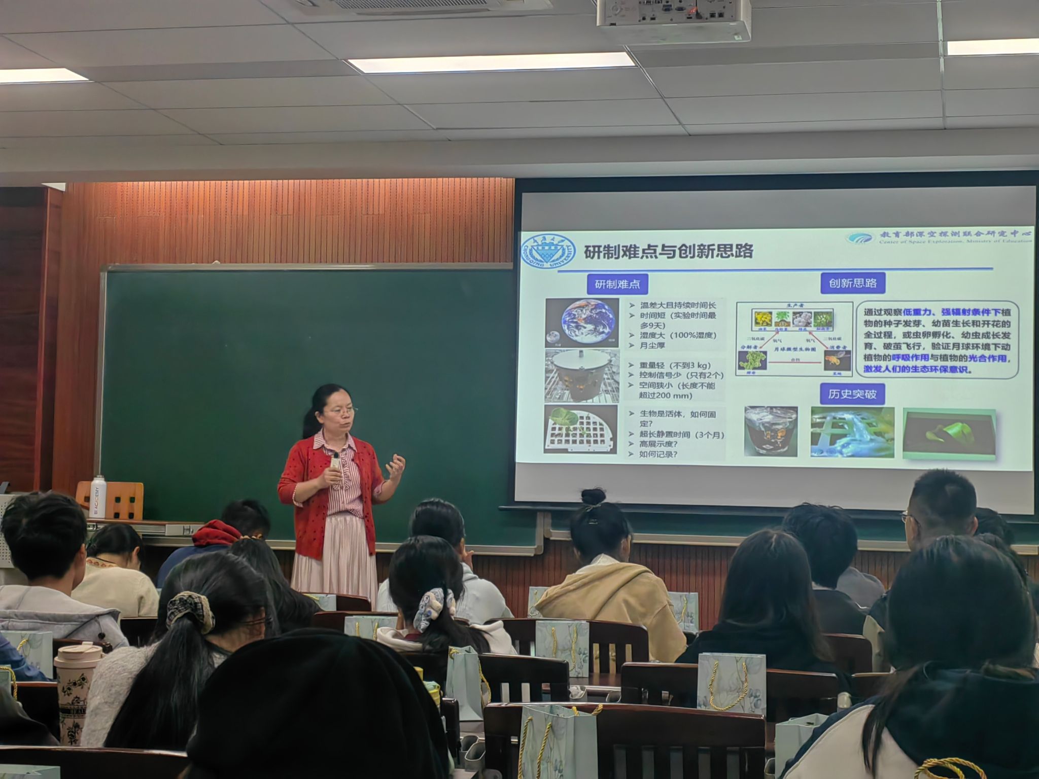 董老师重点展示了由重庆大学牵头研制的嫦娥四号生物科普载荷——人类首个地外星球受控生态实验。该载荷搭载了马铃薯、油菜、棉花、果蝇、酵母等六种生物,构建了一个微型密闭生态系统。在月球极端环境下(温差达300℃),通过水溶棉技术、导光管均匀光照、耐高压密封罐体等六大技术创新,成功实现了棉花种子发芽,诞生了“月球第一片绿叶”。