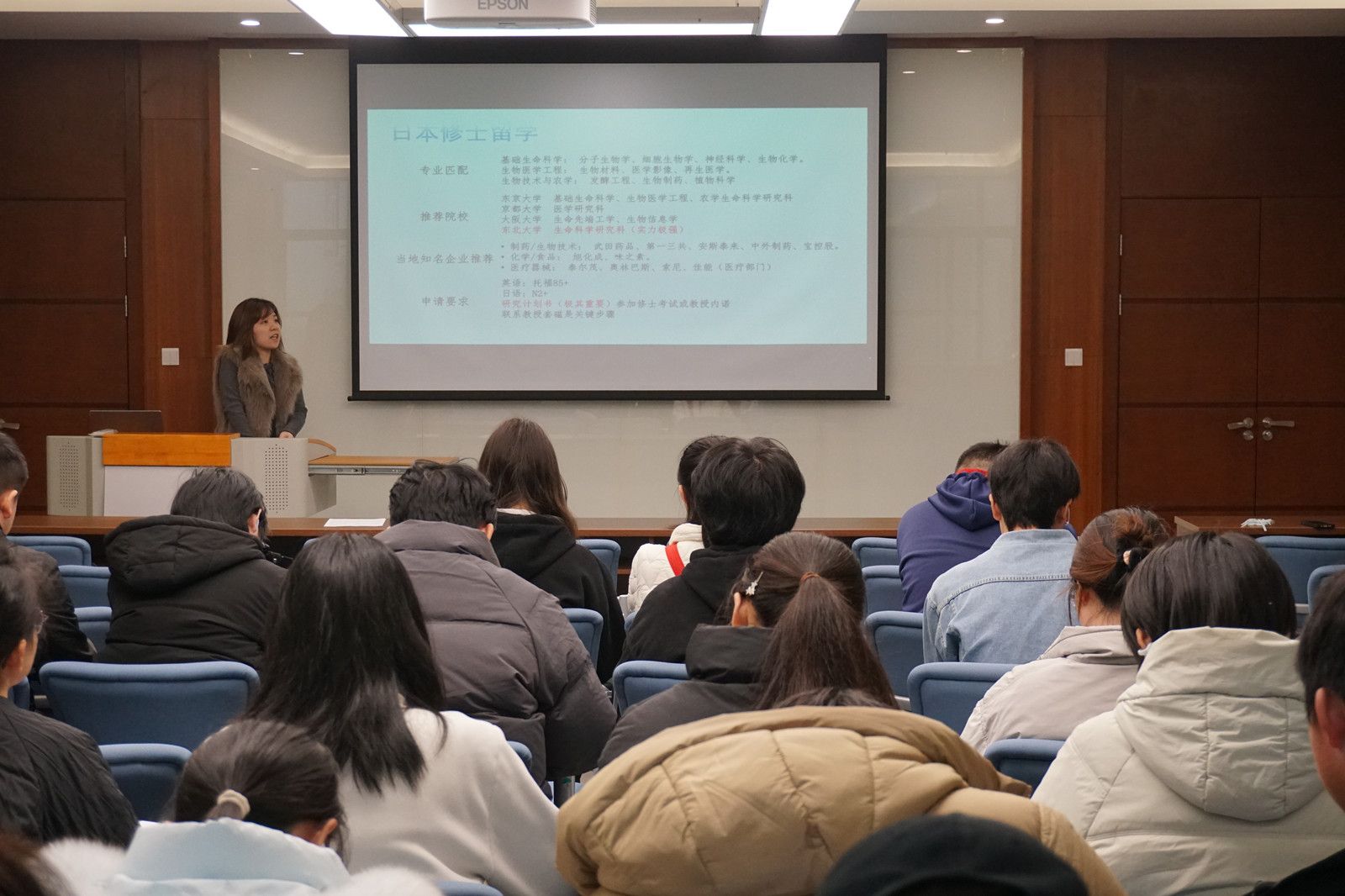 刘老师则详细介绍了法国、意大利、日本、俄罗斯四国的留学状况与语言学习要求。她详细介绍了各国大学的生物学学科专业、可利用资源、奖学金政策、语言要求等,为同学们国外深造指明了有效申请途径。