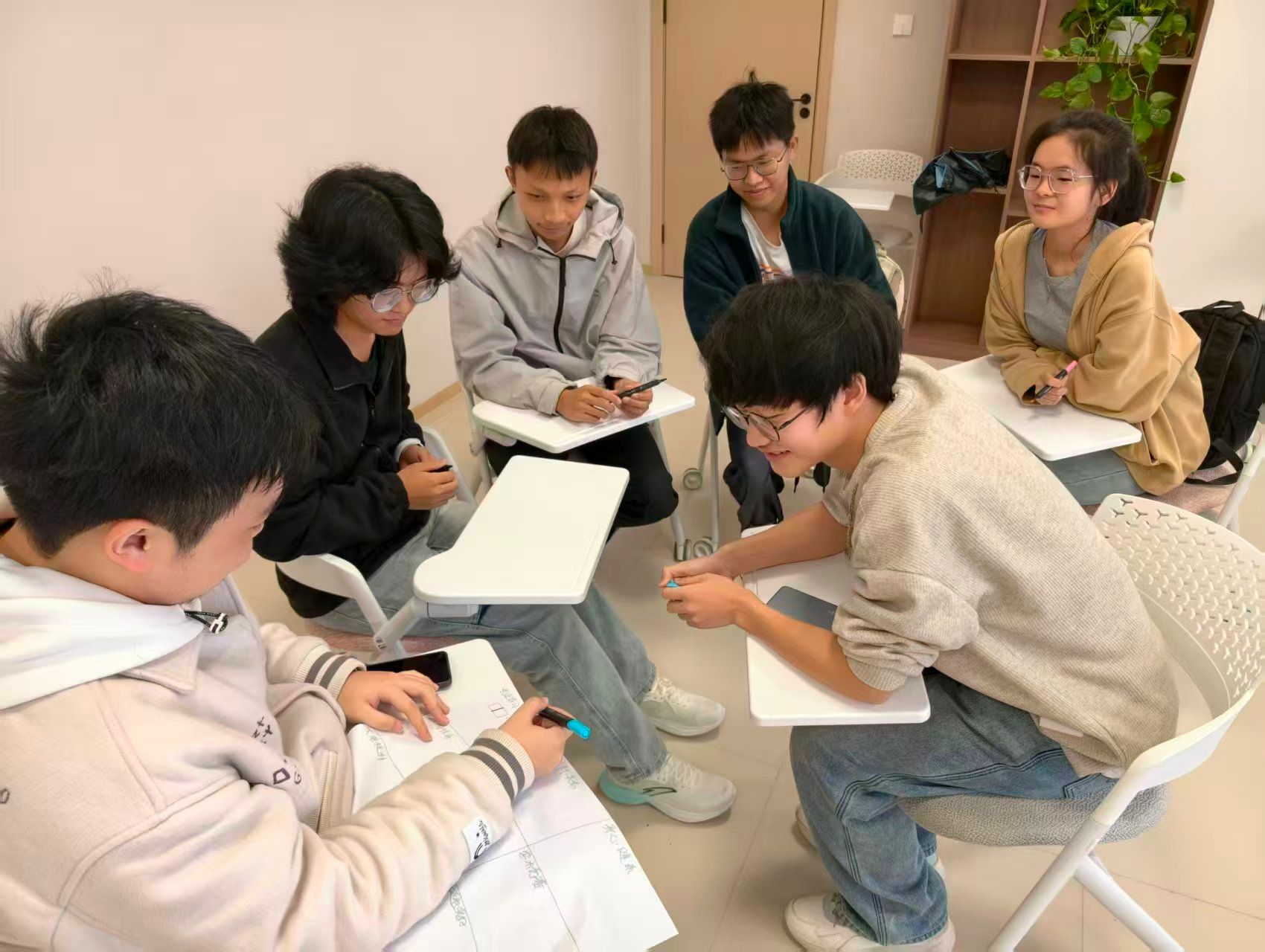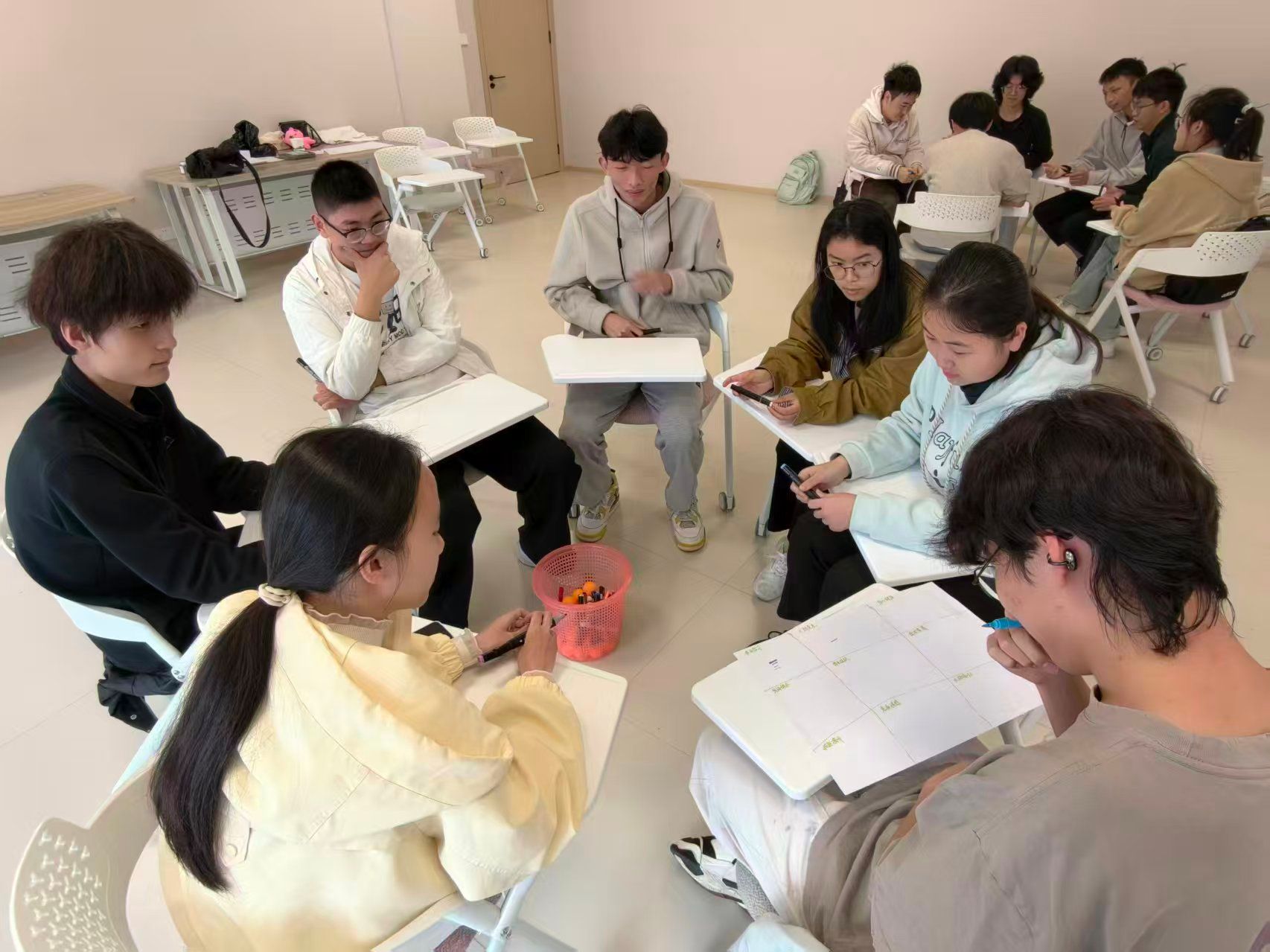 游戏结束后,活动进入深度交流环节。同学们围绕学业压力、情感困惑、成长迷茫等核心话题,通过绘画表达与小组分享的方式,坦诚倾诉自身的焦虑与困惑,互相倾听、彼此共情。在交流中,大家相互鼓励、分享调节情绪的小技巧,有效缓解了内心的压力,也在彼此的陪伴中获得了温暖与力量。