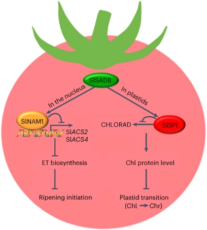 在本研究中,作者鉴定到一个非典型的硬脂酰-ACP脱饱和酶(SAD)蛋白SlSAD8,它具有质体与细胞核双重定位。SlSAD8基因在番茄果实成熟阶段高量表达,通过基因敲除和转基因过表达等实验证实其在果实成熟起始和质体转换中发挥重要的负调控作用。进一步的机制研究表明,SlSAD8同时靶向核基因转录和叶绿体蛋白降解。在细胞核内,SlSAD8与果实成熟起始转录因子SlNAM1互作,干扰后者对乙烯合成基因SlASC2/SlACS4的转录激活。E3连接酶SP1介导的Chloroplast-Associated Protein Degradation(CHLORAD)是一种新发现的叶绿体蛋白降解途径,它通过促进叶绿体蛋白降解来调控番茄果实成熟过程中的质体转化。本研究发现,SlSAD8通过与调控质体转化的E3连接酶SlSP1互作,以干扰CHLORAD途径,从而抑制叶绿体蛋白降解和质体转化。
