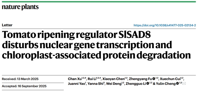 近日,我院李正国教授/成玉林教授课题组在《自然—植物》(Nature Plants)上发表题为“Tomato ripening regulator SlSAD8disturbs nuclear gene transcription and chloroplast-associated protein degradation”的研究论文,揭示了果实成熟中的“一石二鸟”调控机制。研究发现,番茄成熟调控因子SlSAD8通过双重作用扰动核基因转录与叶绿体蛋白降解,负调控果实成熟起始和质体转换。重庆大学为唯一通讯单位。